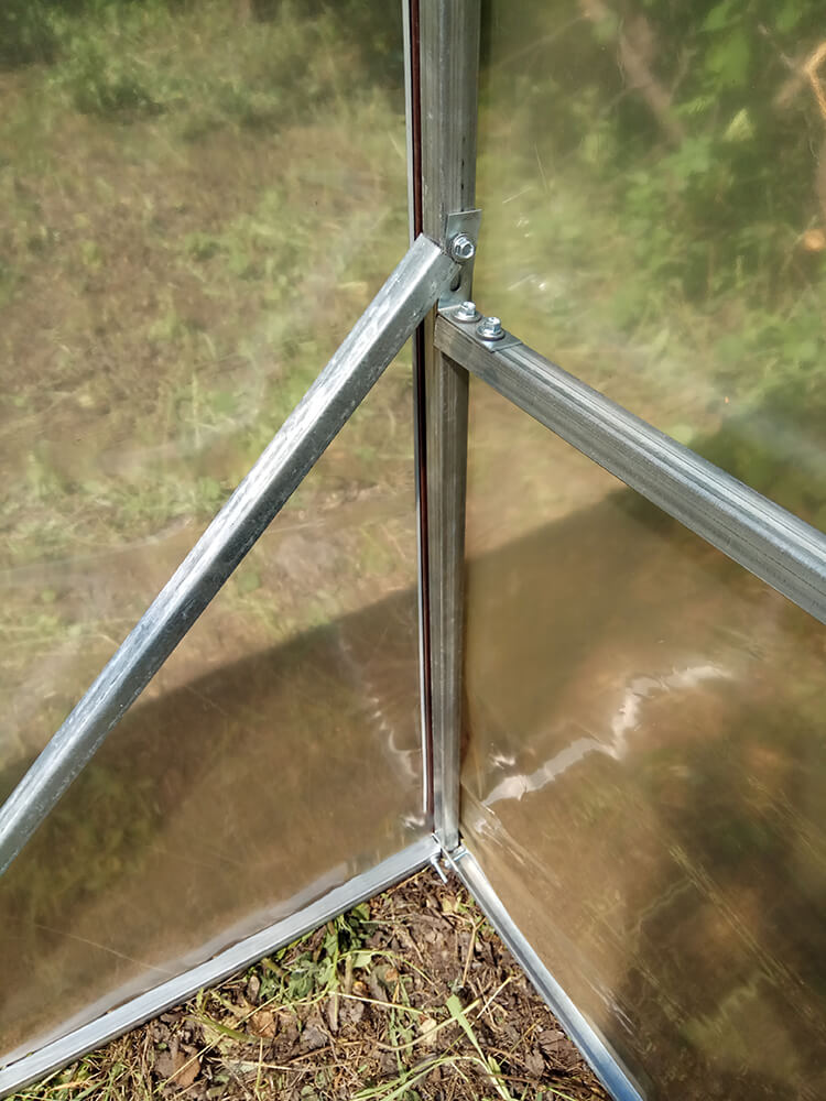 Монтаж теплиці не потребує проведення зварювальних робіт. Елементи каркасу стикуються один з одним з’єднанням двох кінців труб (телескопічне з’єднання) або за допоогою куточків і затягуються болтами. Комплект теплиці включає докладну відеоінструкцію і спрощену друковану версію.