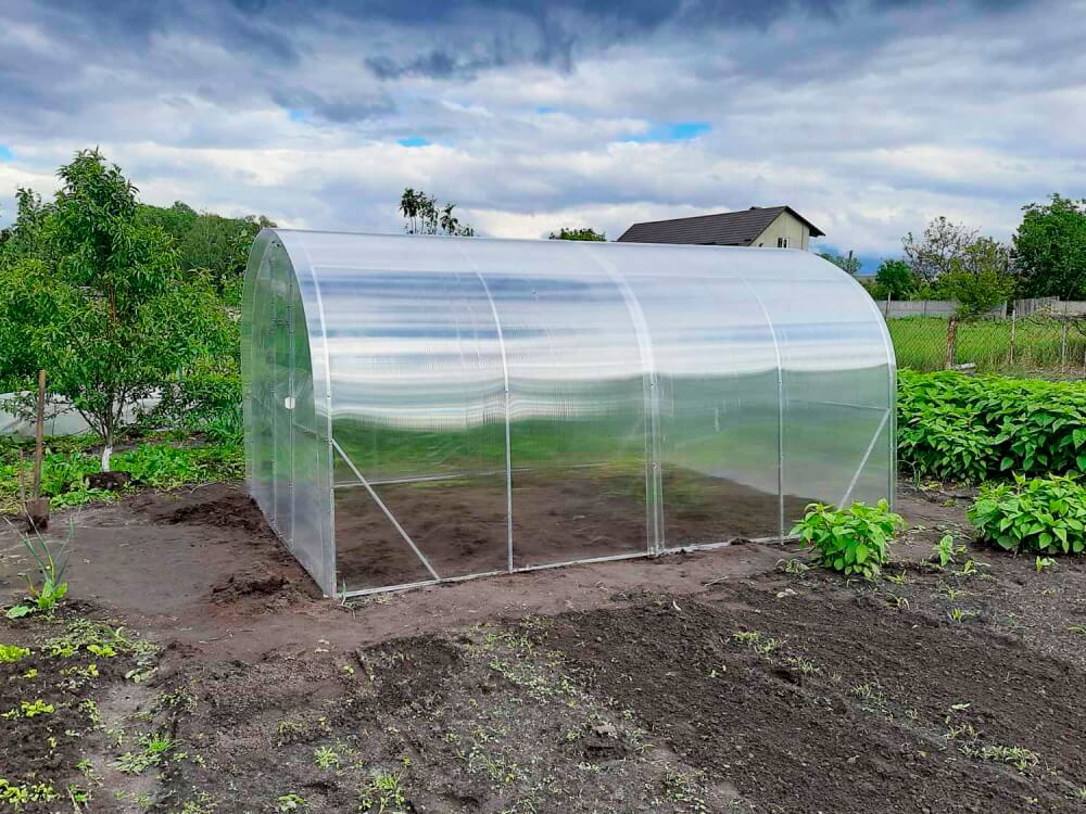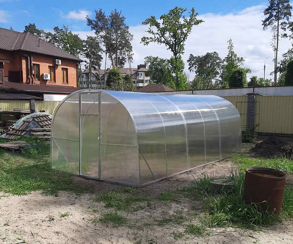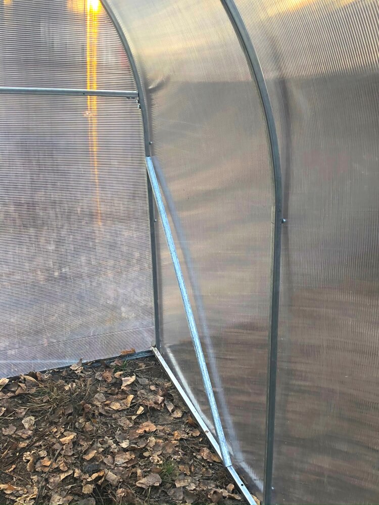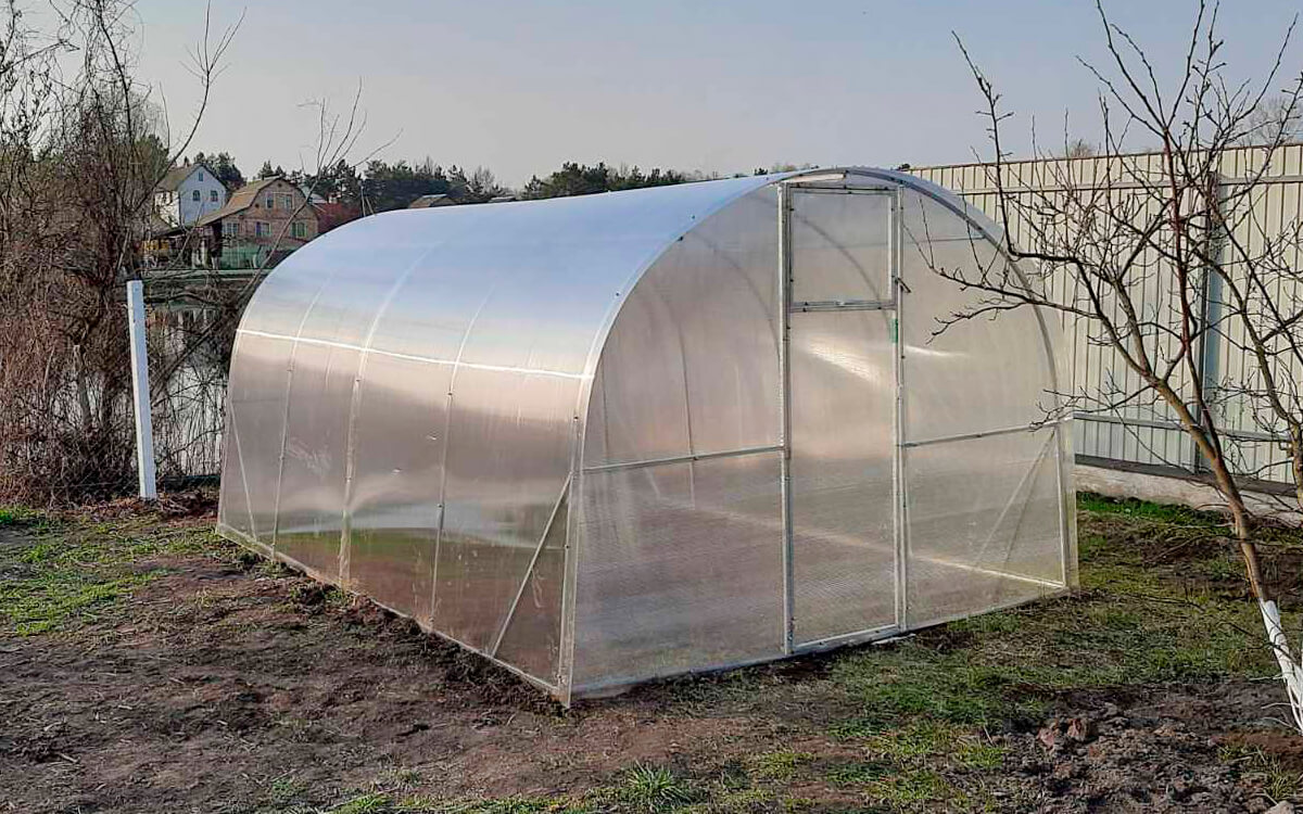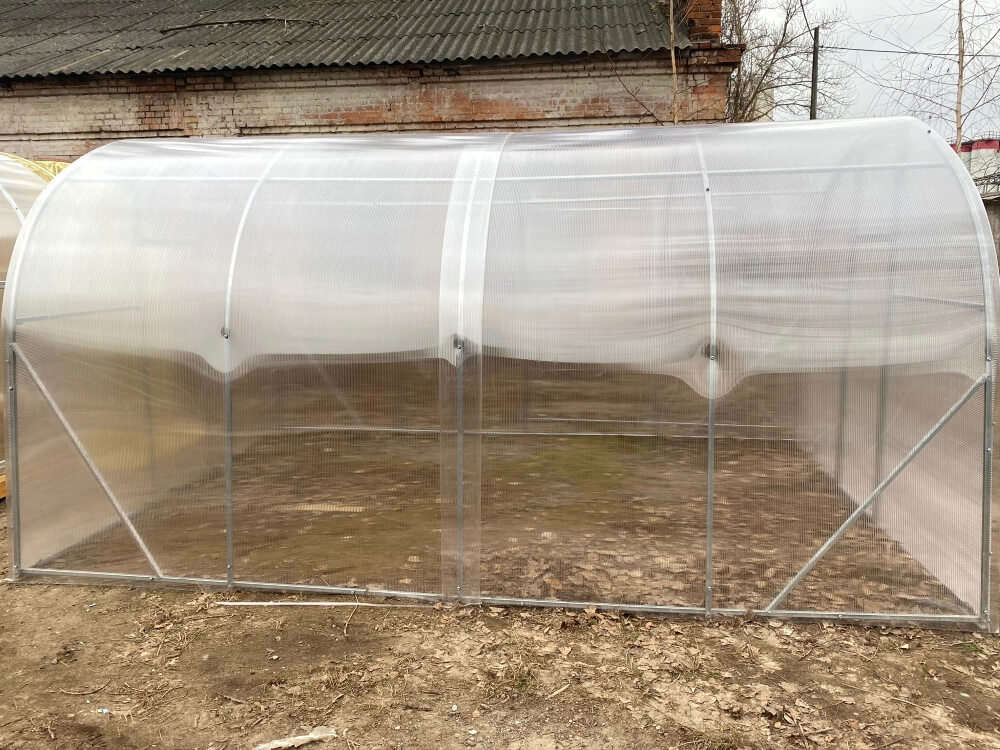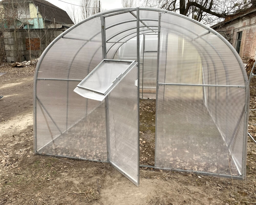 Один торець теплиці має двері з кватиркою, другий – кватирку. Для покриття каркасу використовується стільниковий полікарбонат, що виготовляється спеціально для теплиць.