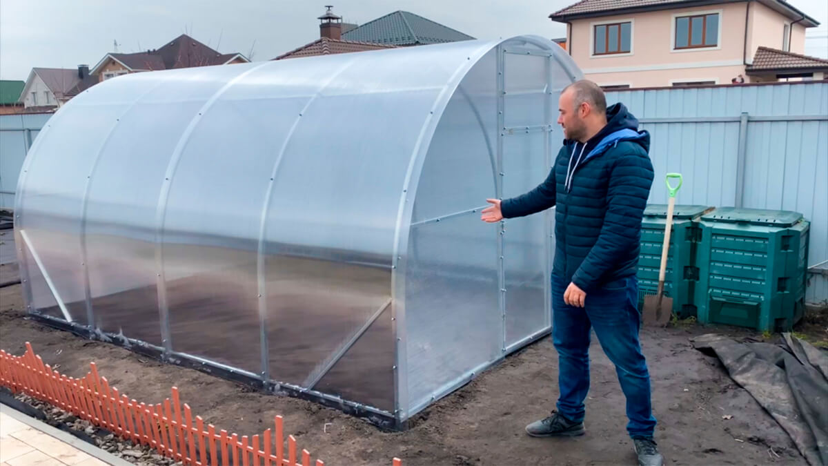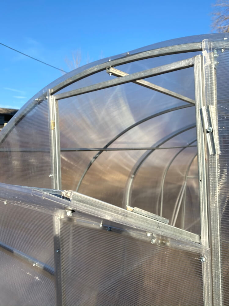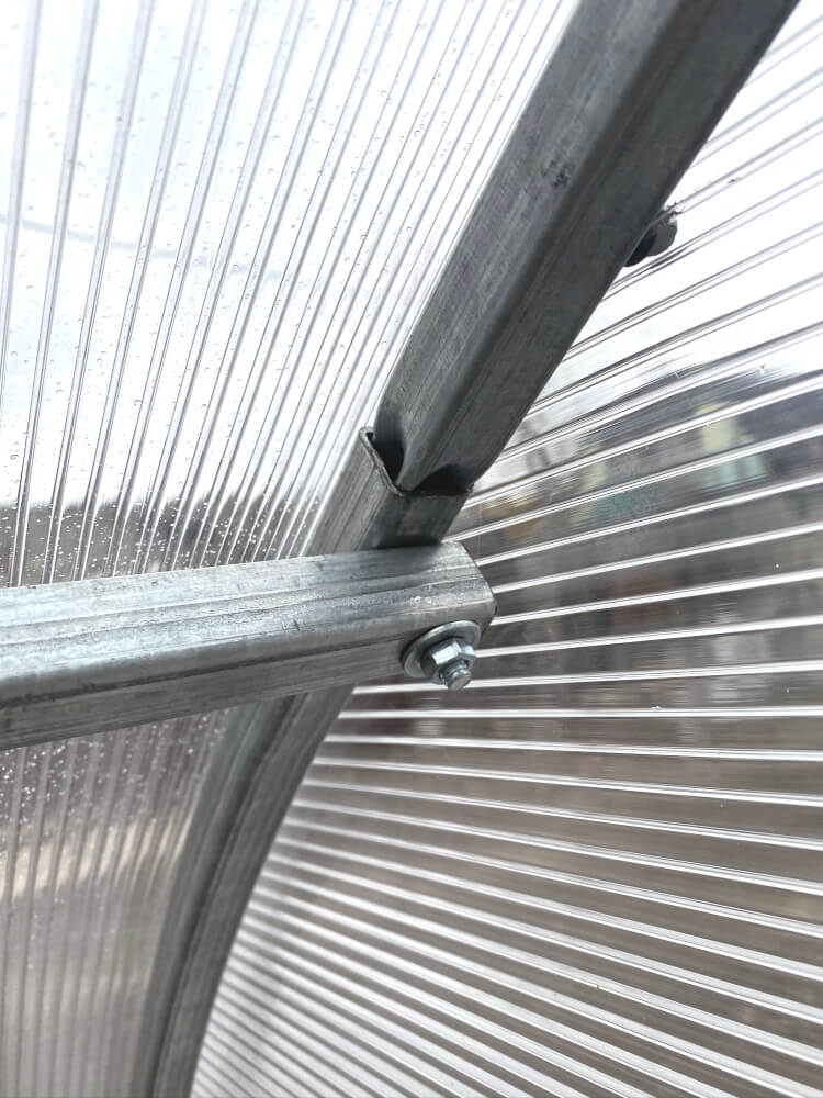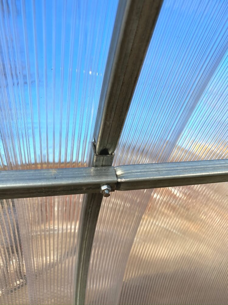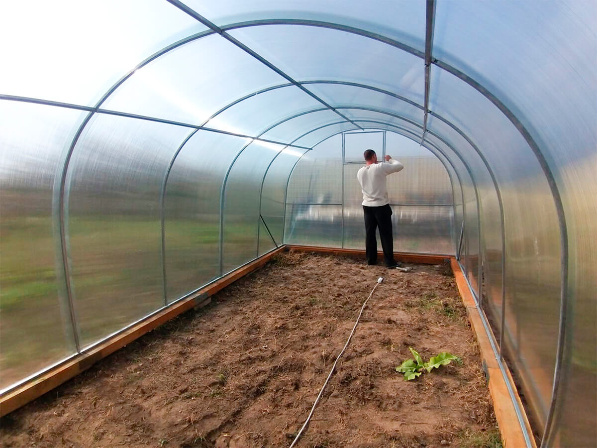 Один торець теплиці має двері з кватиркою, другий – кватирку. Для покриття каркасу використовується стільниковий полікарбонат, що виготовляється спеціально для теплиць.